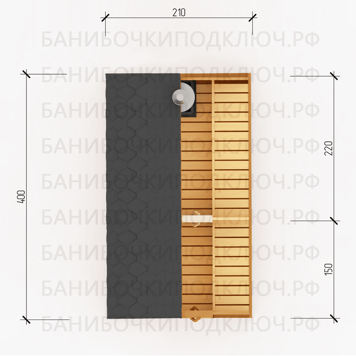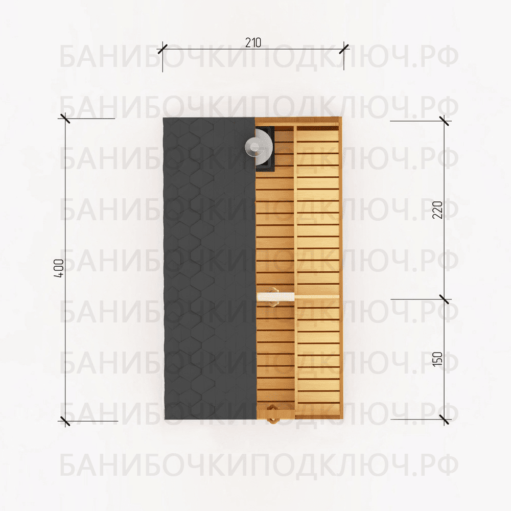комната отдыха – 200х400, парная 250х220, мойка 150х220