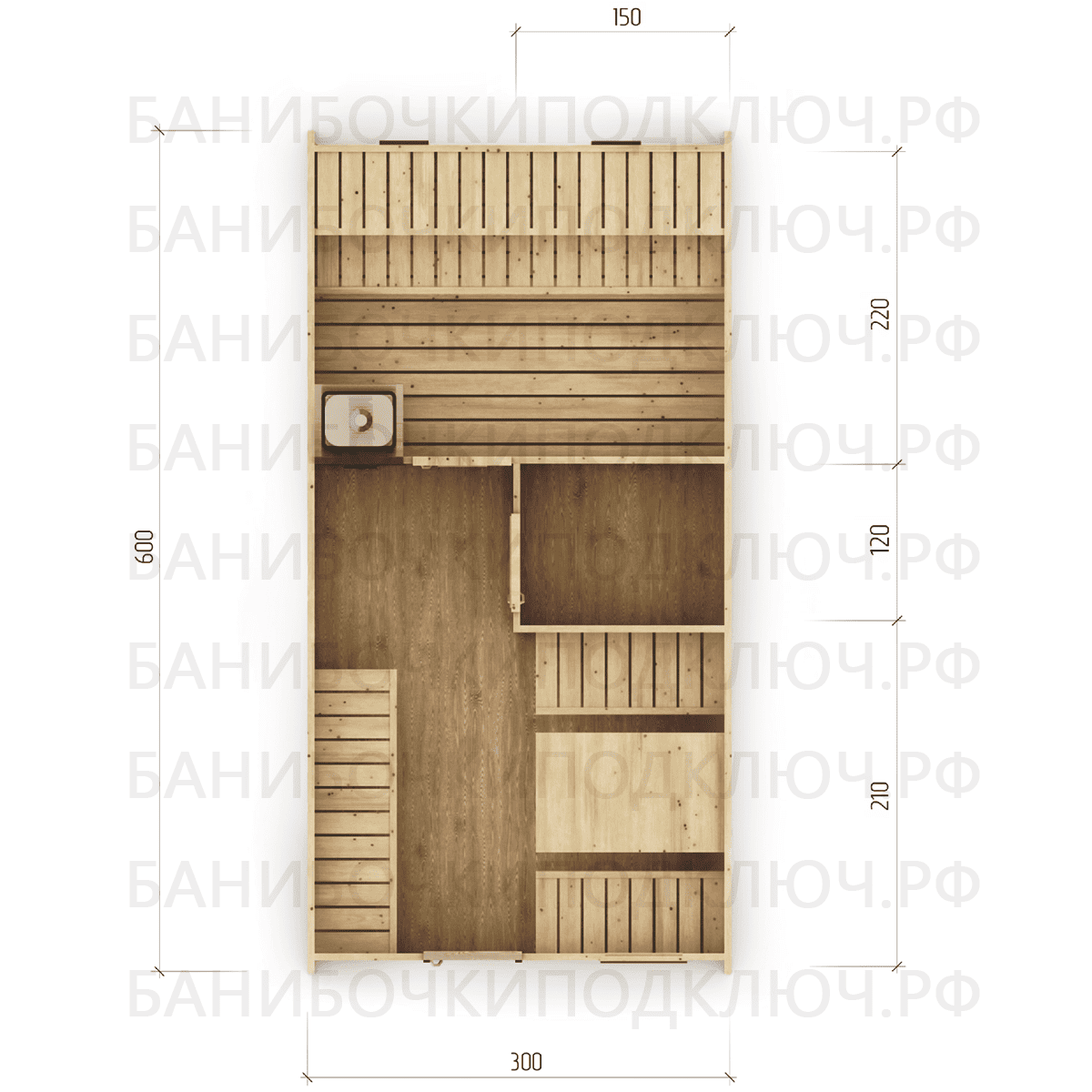 комната отдыха – 350х300, парная 220х300, мойка 120х150