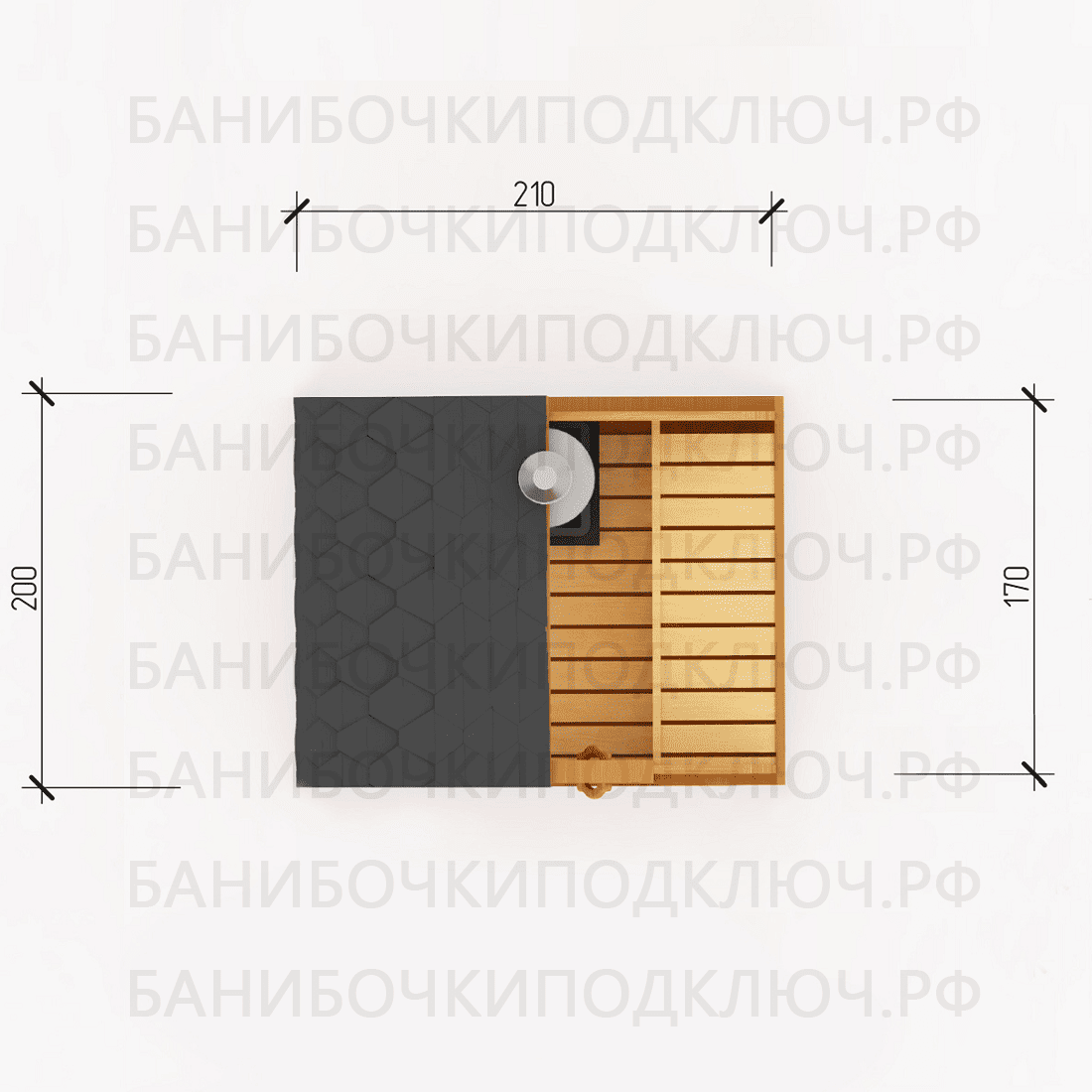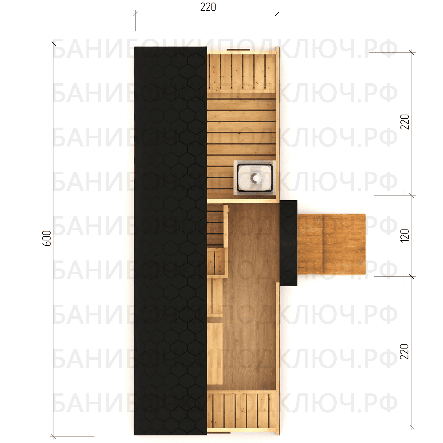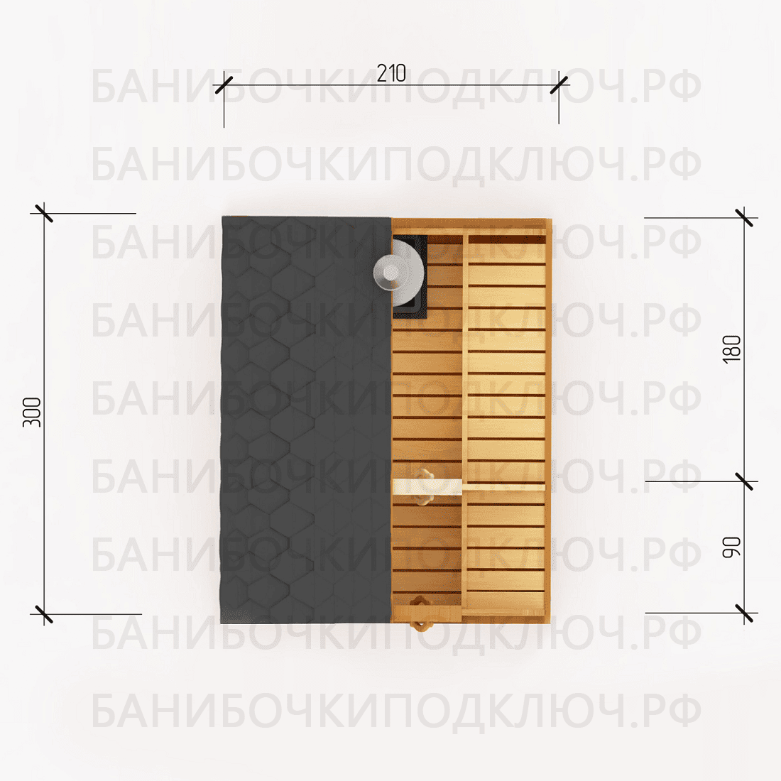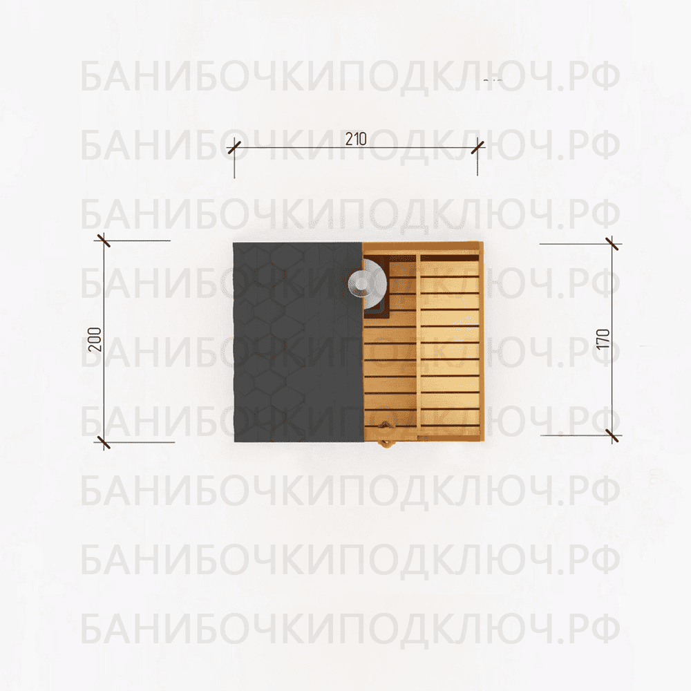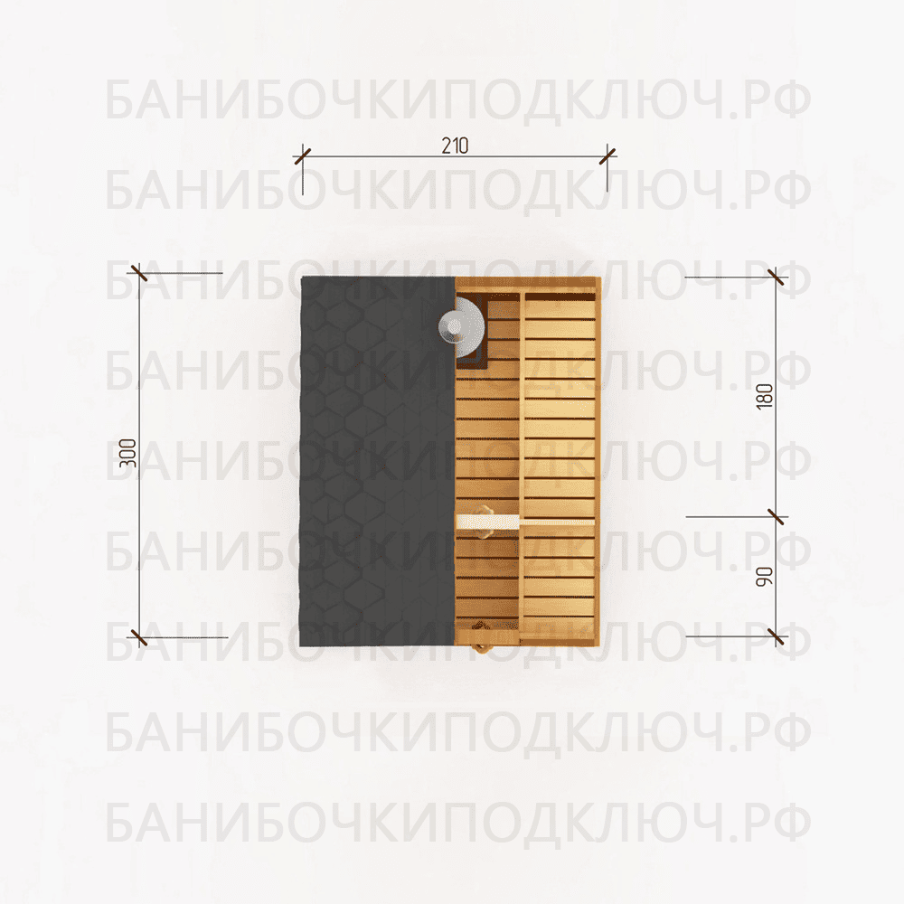 комната отдыха – 200х300, парная 180х220, мойка 120х220