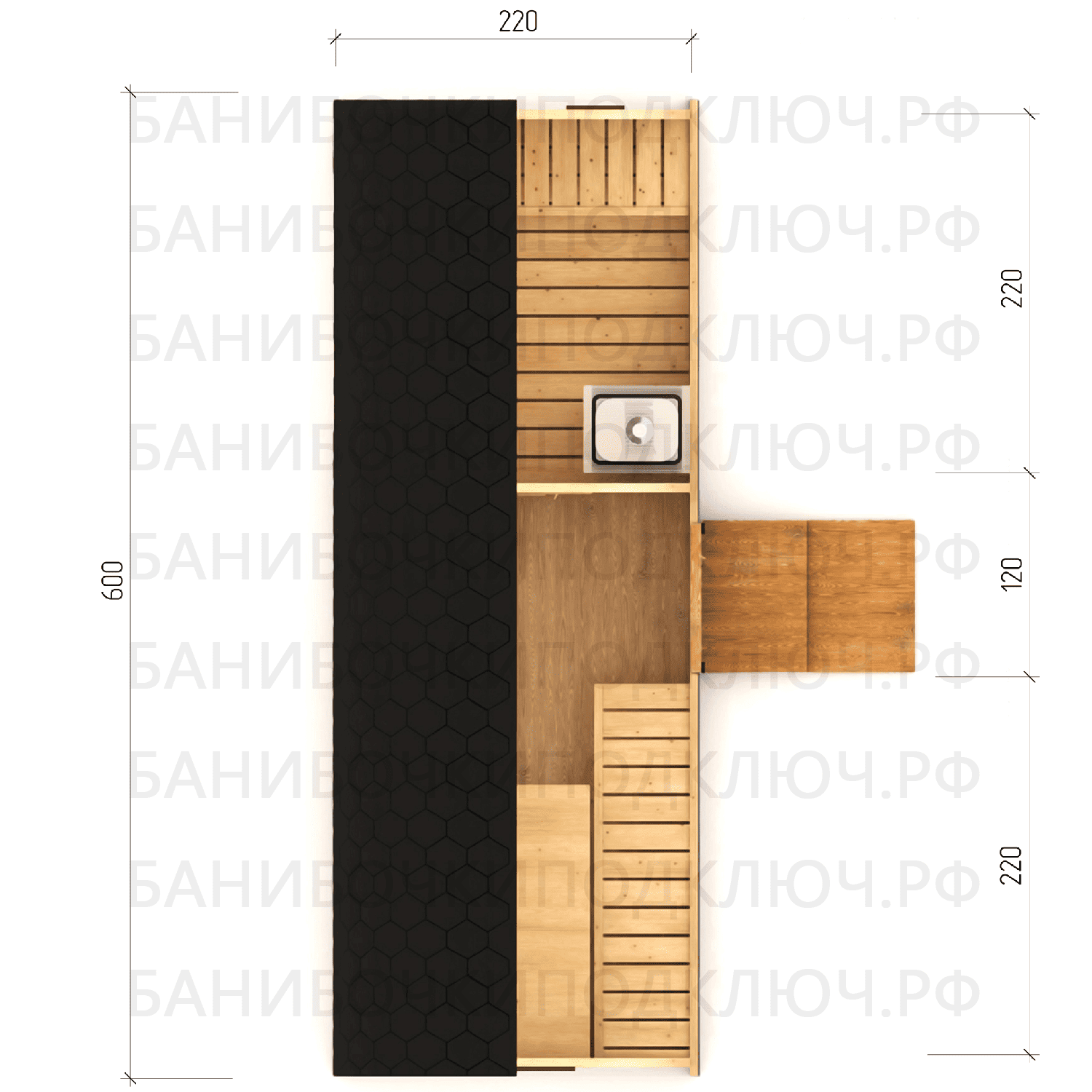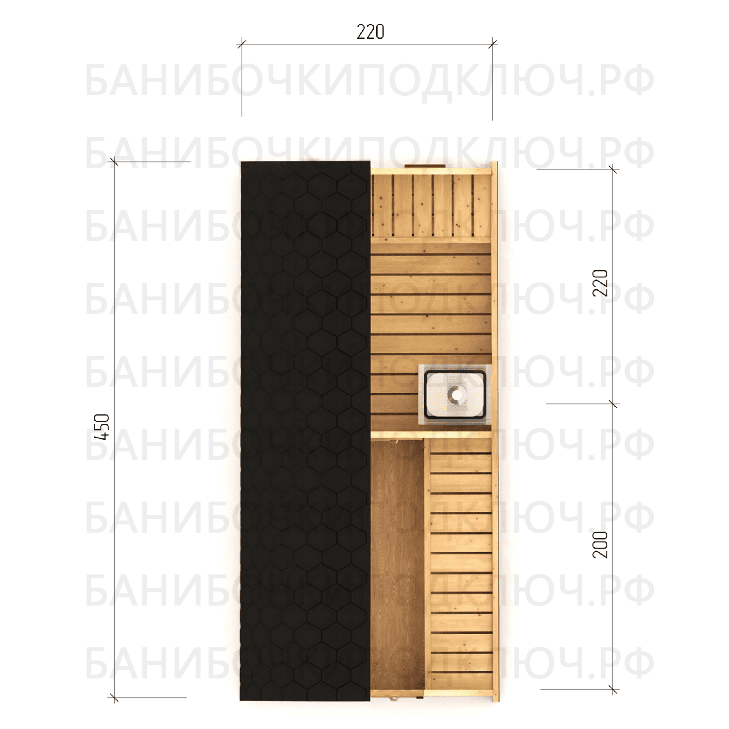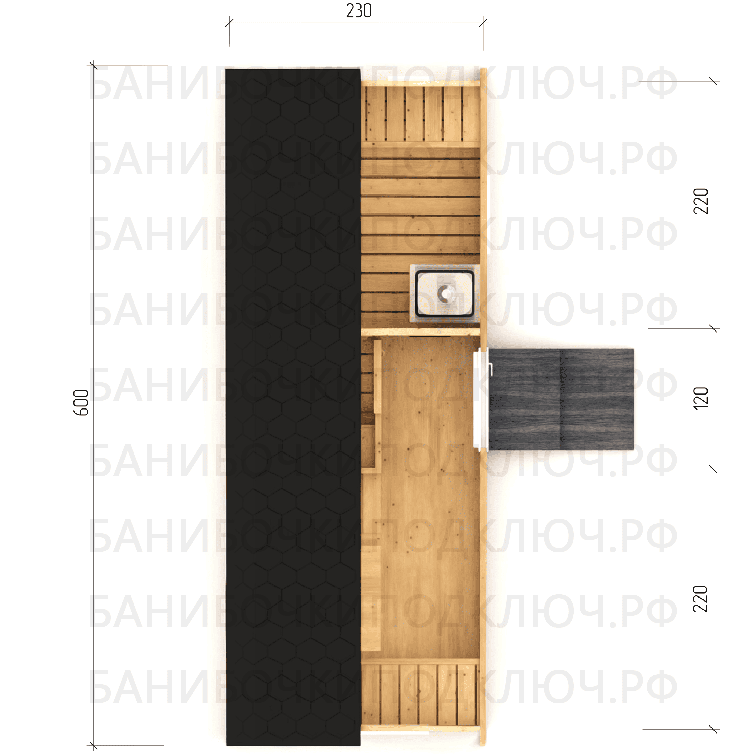 парилка - 200 см, предбанник - 120 см