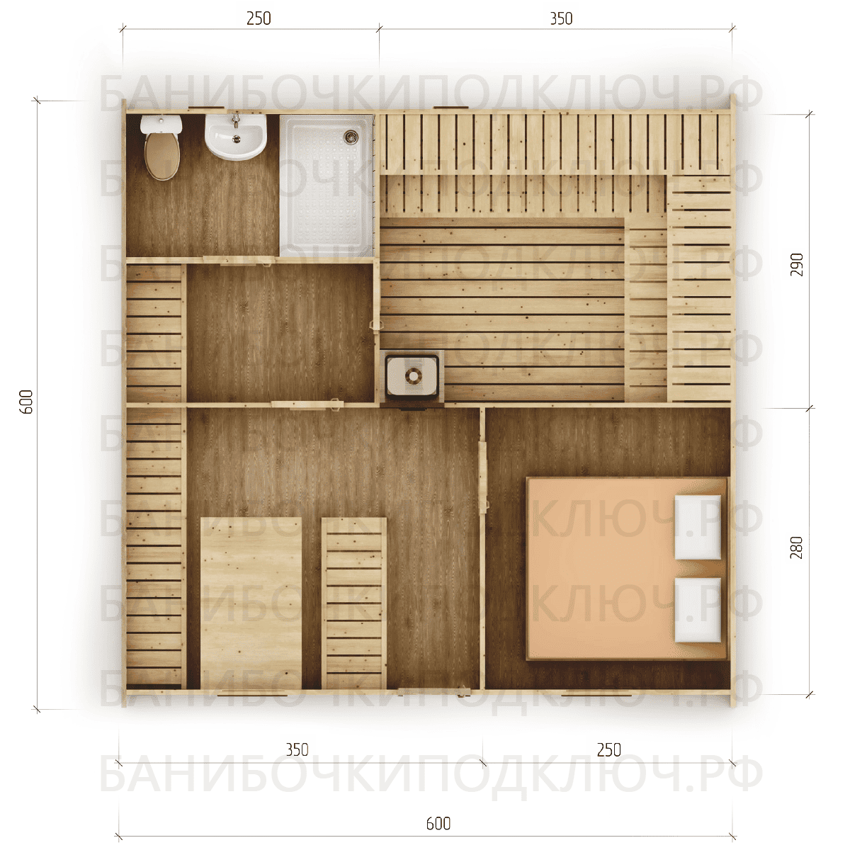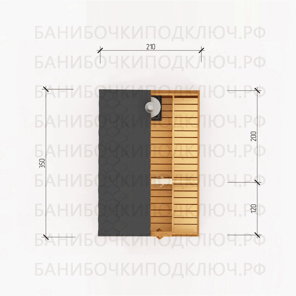 комната отдыха – 350х280, парная 250х280, мойка 290х350, душевая - 120x250, раздевалка 150x250