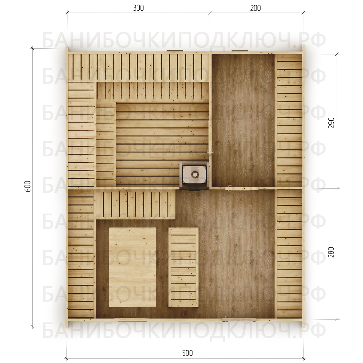 комната отдыха – 500х280, парная 290х300, мойка 200х290