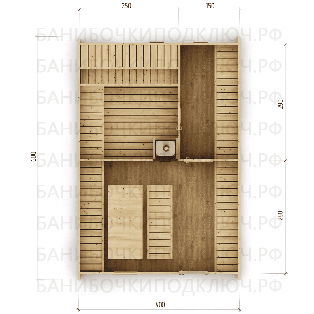 комната отдыха – 280х400, парная 250х290, мойка 150х290